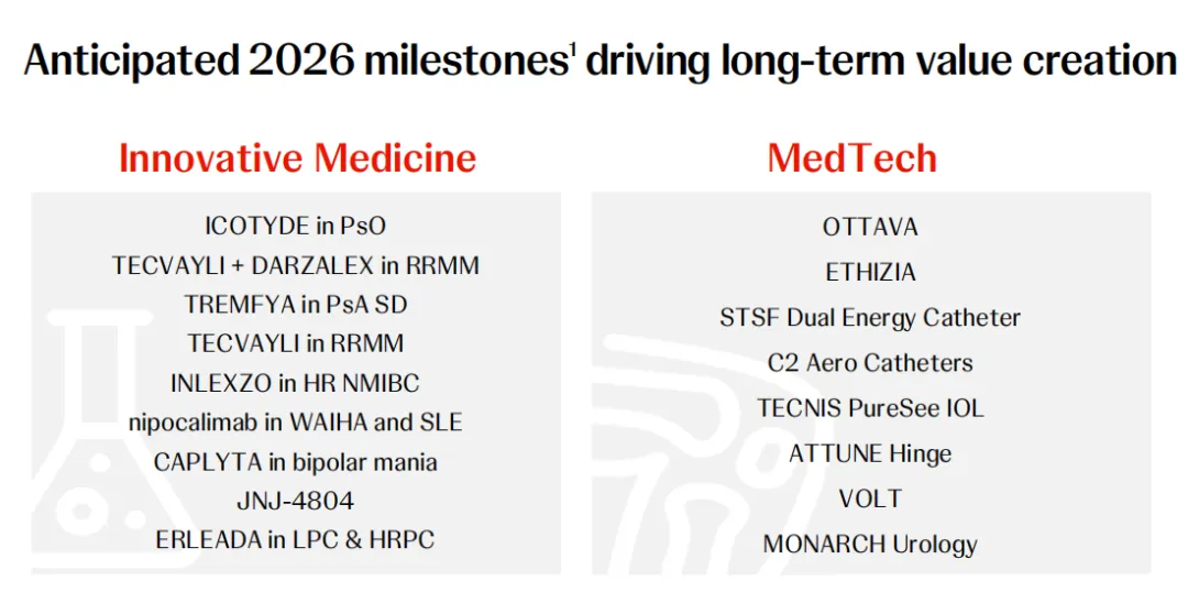 2026 年,强生制药业务有望迎来多项预期里程碑进展,包括 Icotyde(口服 IL-23R 拮抗剂)获批治疗银屑病、Tecvayli (BCMA×CD3 双抗)+ Darzalex(CD38 单抗)获批用于复发/难治性多发性骨髓瘤、Tremfya(IL-23 抑制剂)获批用于患者结构性关节损伤获得监管机构等等。此外,强生在肿瘤学、免疫学和神经科学领域也有许多重要的监管申报和数据发布。强生认为 2026 年将是公司加速增长的一年,其营业收入有望首次突破 1000 亿美元大关。