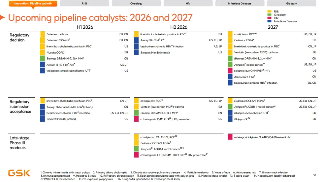 目前,GSK 产品管线中有 58 个资产,其中包括 17 个 Ⅲ 期临床阶段项目。展望 2026 年,GSK 预期将有 5 项关键临床数据读出,并启动 10 项关键临床试验。