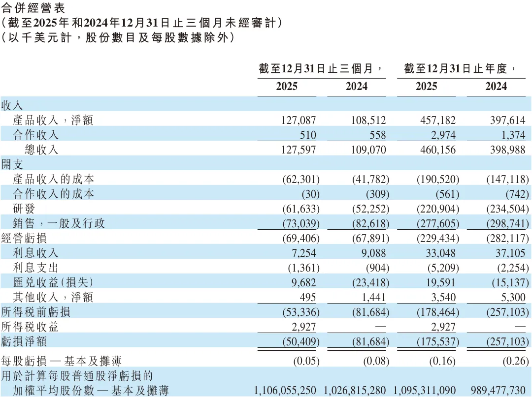 财报显示,2025年公司全年总收入达到4.602亿美元,同比增长15%,其中产品收入净额为4.572亿美元,同比增长15%。尽管仍处于亏损状态,但全年净亏损额从2024年的2.571亿美元收窄至1.755亿美元,减亏幅度显著,经营效率持续提升。
