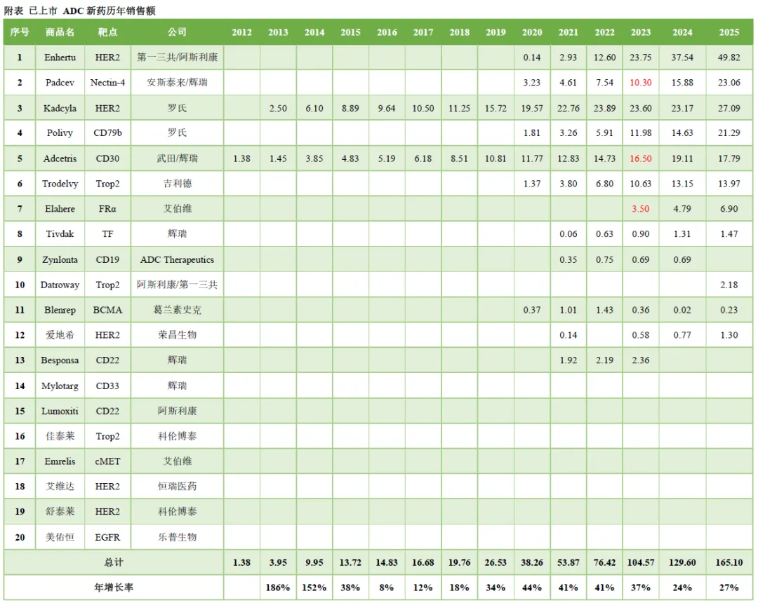 更重要的是,抗体药已经进入抗体plus阶段,双抗、ADC等新形式进入高速增长阶段,迎来第二增长曲线。全球范围内20款ADC新药合计销售额165.1亿美元,同比增长27%,仍然保持高速增长,6款ADC为销售额超10亿美元的重磅炸弹产品,其中4款超20亿美元的超级重磅炸弹。