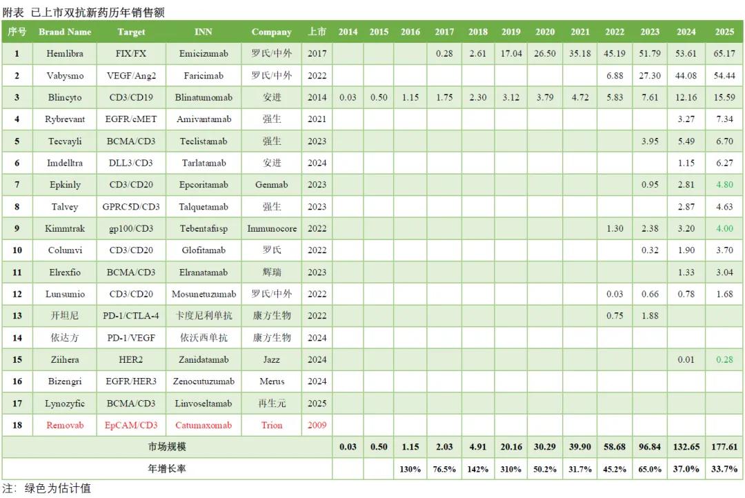全球范围内18款已上市双抗新药合计销售额为178亿美元,同比增长34%,如果计入康方生物2款双抗,销售额超过180亿美元,