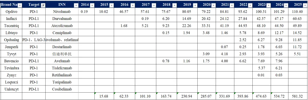从靶点角度来看,PD-1/PD-L1市场规模为581亿美元。