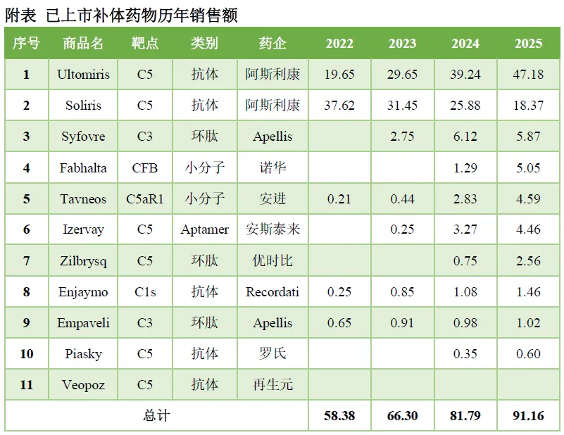 补体药物市场规模91亿美元,C5和C3仍保持增长,主要源于NMOSD、眼科地图样萎缩适应症的扩展。诺华CFB小分子处于快速放量阶段,预计很快跻身重磅炸弹级别。