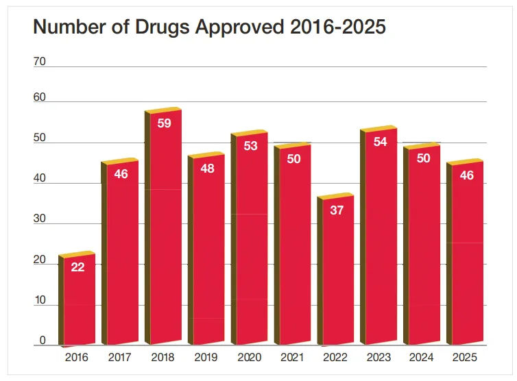 ▲FDA自2016年至2025年批准的新药数量(图片来源:参考资料[1])