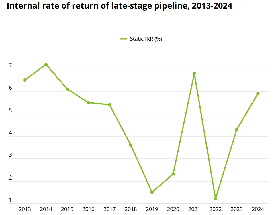 德勤2025年度追踪医药创新回报的报告显示,全球头部制药企业的研发回报率从2010年的10.1%下降到2022年的1.2%,直到近两年,得益于肥胖症和糖尿病等领域中,大量高价值产品产品进入后期阶段,研发回报率才有所上升,2024年回到5.9%。