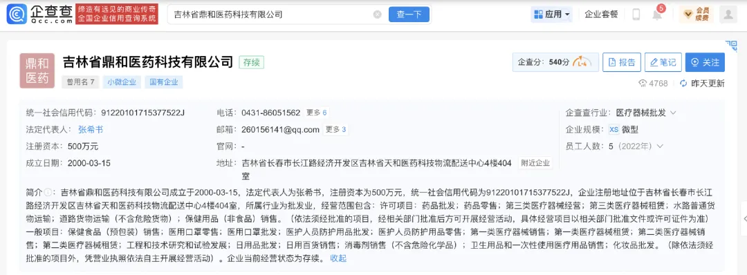 企查查数据显示,吉林省鼎和医药科技有限公司成立于2000年,注册资本为500万元,为微型企业,经营范围包括药品批发;药品零售;第三类医疗器械经营;第三类医疗器械租赁等。旗下有两家分支机构,不过企查查均标注为“吊销”。