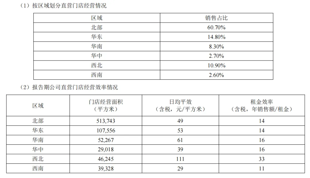 进一步从销售占比来看,北部区域销售额占国大药房总销售的60.7%,且直营门店平均经营面积居各区域之首,但整体经营效率仍有提升空间,这或许也是国大药房推进区域资产优化的重要原因。