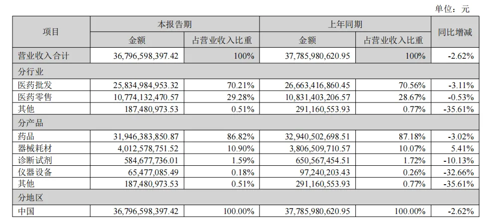 2025年上半年,国药一致实现营业收入367.97亿元,同比下降2.62%;归属于上市公司股东的净利润6.66亿元,同比下降10.43%。其中分销板块实现营业收入267.83亿元,同比下降1.09%;实现净利润4.82亿元,同比下降7.82%。