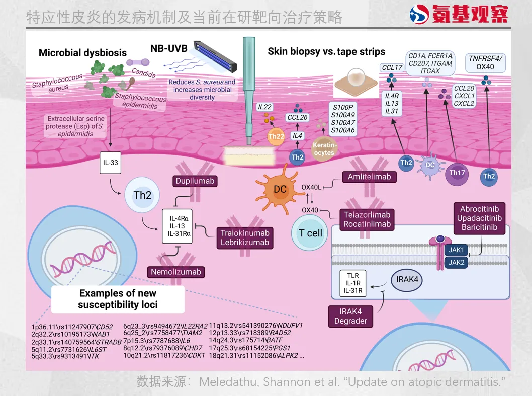 除了IL 4Rα,还有多种免疫靶点被挖掘。尽管AD的免疫机制复杂目前并未完全厘清,但已知的是AD的发病与Th2介导的免疫失衡相关,促炎因子(如IL 4、IL 13)异常活跃,引发皮肤屏障受损、瘙痒及炎症反应。