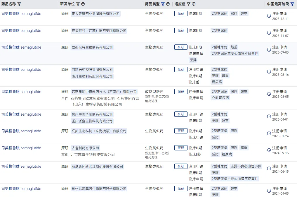 药智数据显示,全球已有十余款司美格鲁肽生物类似药提交上市申请,包括Sandoz、Teva全球仿制药巨头,九源基因、丽珠集团、齐鲁制药、联邦制药、华东医药、正大天晴等国内药企,以及石药集团的改良型新药。