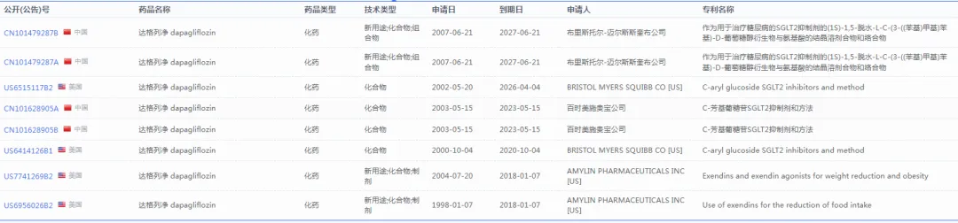 药智数据-专利到期药品筛选系统显示,恩格列净在美国的专利将于2027年陆续到期,最晚的专利保护期至2034年。