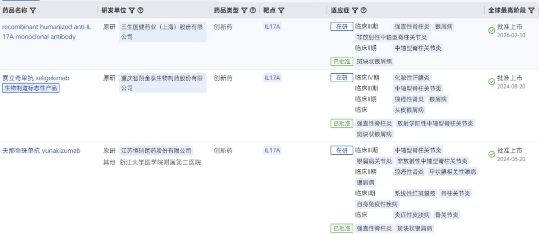 另外,恒瑞的夫那奇珠单抗、智翔金泰的赛立奇单抗,以及三生国健的安沐奇塔单抗三款国产IL-17单抗已获批上市,形成新的竞争势力。