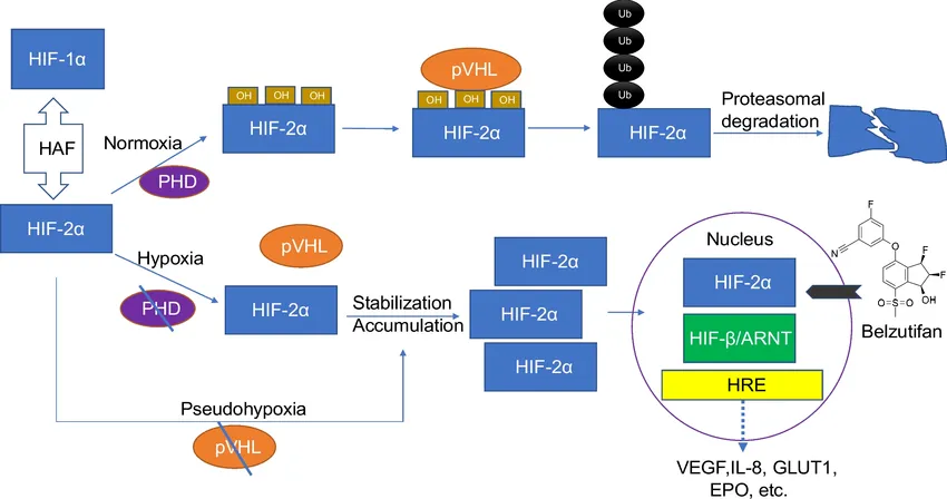 2021年8月,美国FDA批准Welireg上市,用于治疗VHL疾病相关肿瘤,包括肾细胞癌、中枢神经系统血管母细胞瘤和胰腺神经内分泌肿瘤(pNET),成为首个获批上市的HIF-2α抑制剂。2023年,FDA进一步批准其扩展适应症,用于既往接受PD-1/PD-L1抑制剂和血管内皮生长因子酪氨酸激酶抑制剂(VEGF-TKI)治疗后疾病进展的晚期RCC患者。