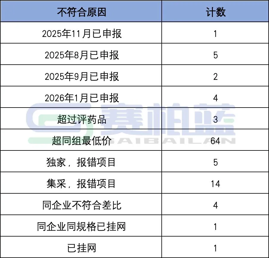 从违规类型看,104个未通过药品中,64个因报价超出同组最低价被拒,占比超六成;4个因同企业产品间不符合差比价规则未通过;还存在重复申报、项目报错、已挂网等非价格类违规。