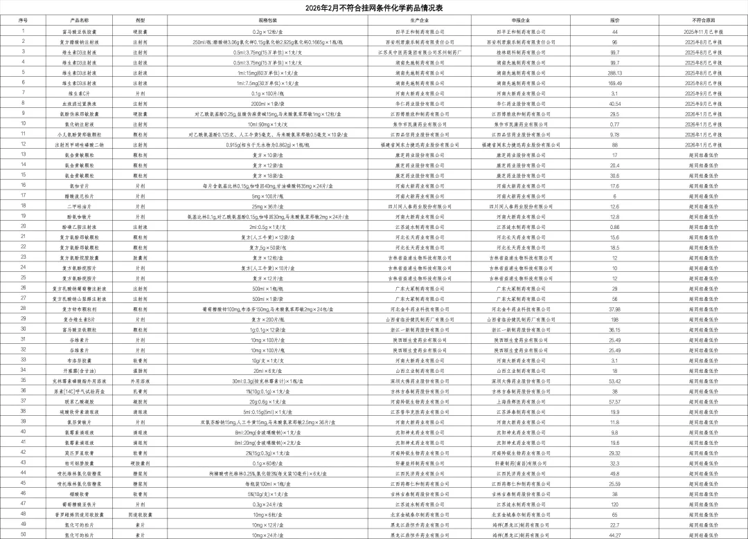 附:2026年2月不符合挂网条件化学药品情况表