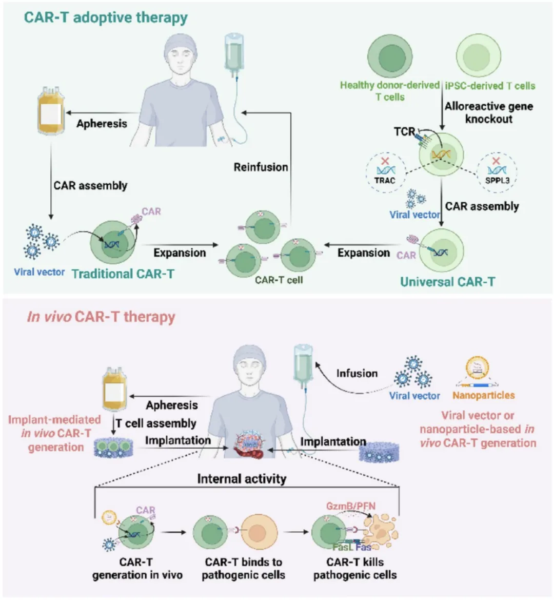然而,自体CAR-T的个体化制造模式存在难以突破的瓶颈:需从患者体内采集 T 细胞,经体外激活、基因转导与扩增后回输,生产周期长达 2-4 周,且制造失败率高、成本居高不下,严重限制了其临床可及性。围绕“规模化生产与可及性提升”这一核心命题,CAR-T技术进入分化发展新阶段,异体通用型CAR-T与体内CAR-T成为两大核心探索方向。