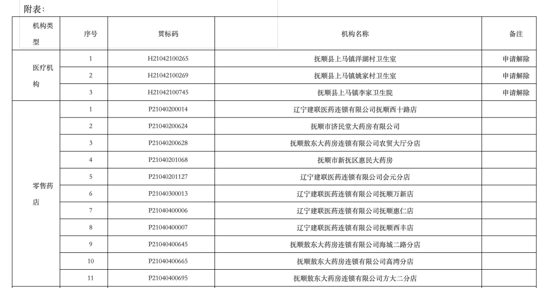 附:辽宁抚顺解除3家医疗机构、33家零售药店医保定点协议名单