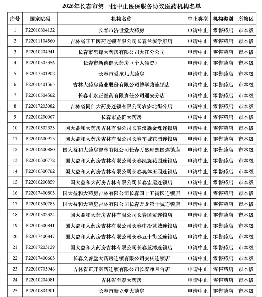 2026年长春市第一批中止医保服务协议医药机构名单