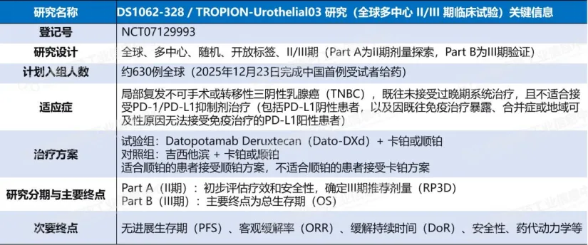 靶向TROP2的德达博妥单抗在去年10月迎来高光时刻,TROPION-Breast02研究显示,在不适合免疫治疗的转移性三阴性乳腺癌一线治疗中,它相比化疗将中位总生存期延长5个月(23.7个月 vs. 18.7个月),疾病进展或死亡风险降低43%,客观缓解率达62.5%,成为首个在该人群中延长总生存的TROP2 ADC。针对尿路上皮癌,Dato-DXd联合化疗的DS1062-328研究于去年12月在国内完成首例给药,剑指EV+帕博利珠单抗治疗后的未满足需求。