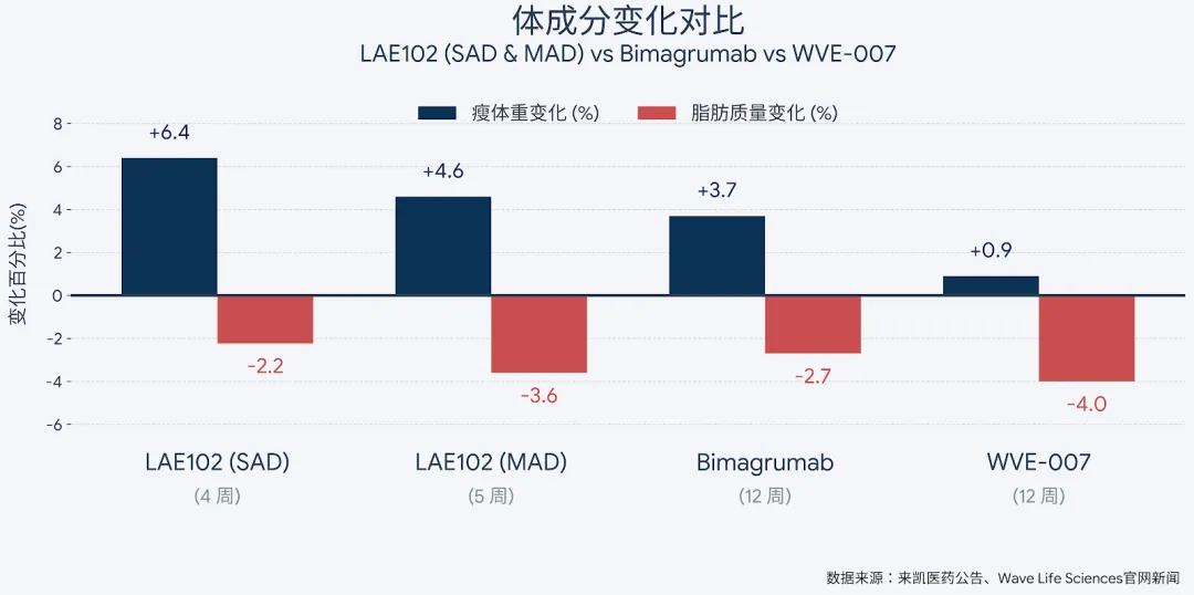 可以看出,来凯医药的LAE102早期信号强度非常突出,在4~5周的时间内就超过Bimagrumab在12周时的增肌表现,减脂效果不相上下;小核酸药物WVE-007虽然有不错的减脂效果,但是增肌效果尚不明确。