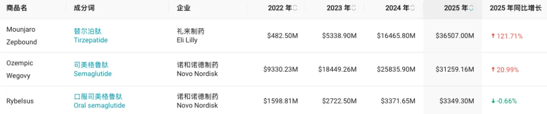 2025 年,替尔泊肽、司美格鲁肽销售额分别高达 365.07 亿美元、346.08 亿美元。其中,减重版替尔泊肽 Zepbound 销售额为 135.42 亿美元,同比增长 175%;减重版司美格鲁肽 Wegovy 销售额为 119.92 亿美元,同比增长 41%。