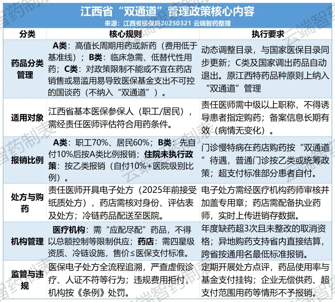 2025年3月,江西省发出《江西省国家医保谈判药品“双通道”管理办法》,江西省对药品纳入“双通道”实行分类管理,分A、B、C三类。