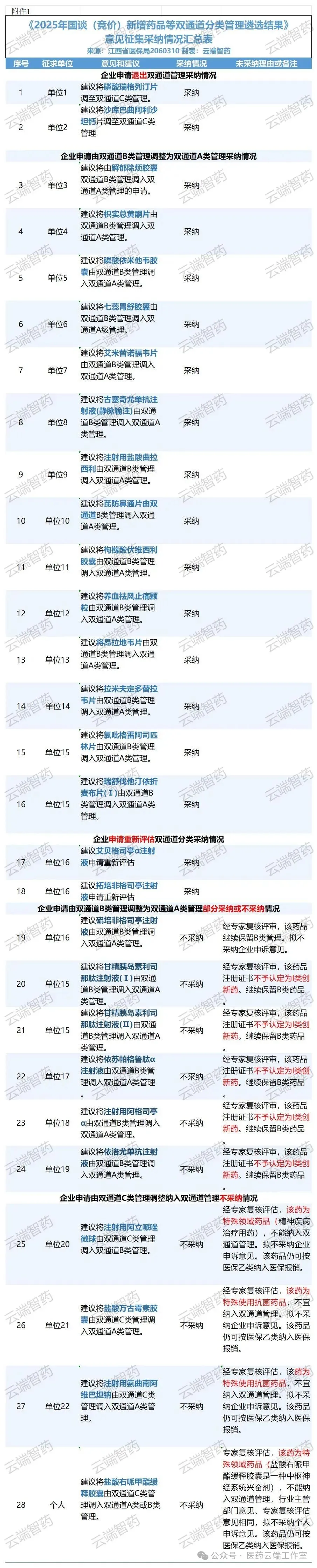 解郁除烦胶囊等14个品种由双通道B类调整为A类管理的申请被采纳;医保局也采纳了艾贝格司亭α注射液、拓培非格司亭注射液申请重新评估的申请。但,对于将注射用阿立哌唑微球等4个品种由C类管理调入双通道B类管理的申请不予采纳。(完整表格附文末)