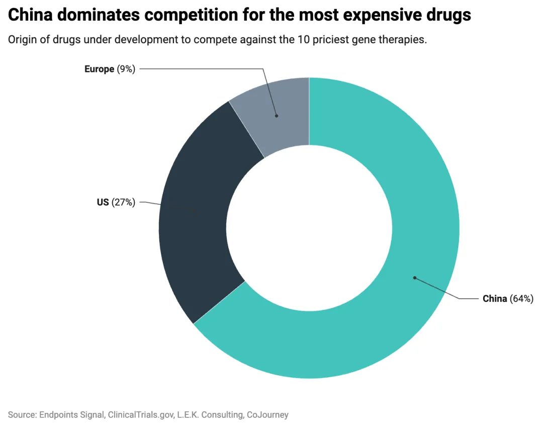 据Endpoints最近披露的数据,目前全球十大最昂贵的基因疗法共有77个在研同类竞品,其中48个来自中国,数量是美国在研项目的两倍以上,更是欧洲的7倍。