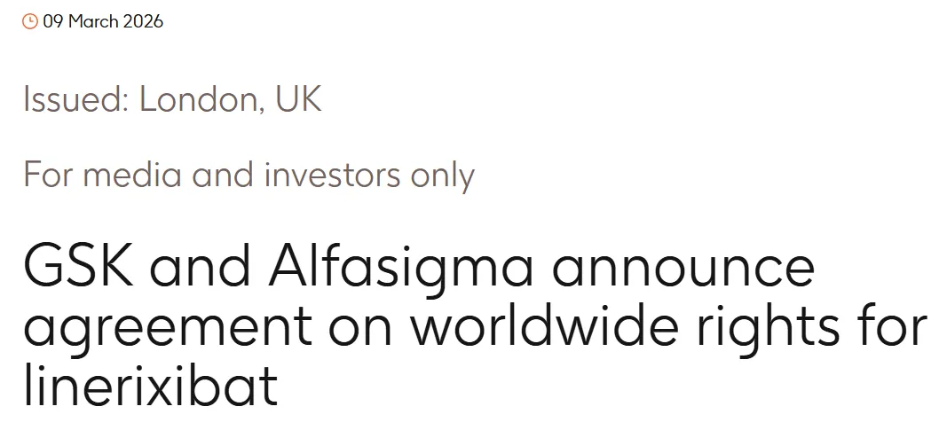 2026年3月9日,GSK宣布与Alfasigma达成合作。根据协议,Alfasigma将获得利奈昔巴特(linerixibat)在全球范围内的独家开发、生产和商业化权利。