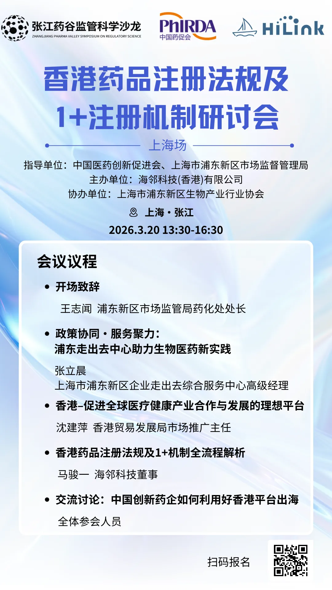 “香港药品注册法规及1+机制系列研讨会-上海场”将于2026年3月20日在上海浦东召开,具体活动安排详见下方活动海报,欢迎扫码报名参加。