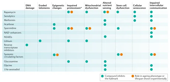 图 1. 具有潜力的抗衰药物及其对不同衰老标志的影响