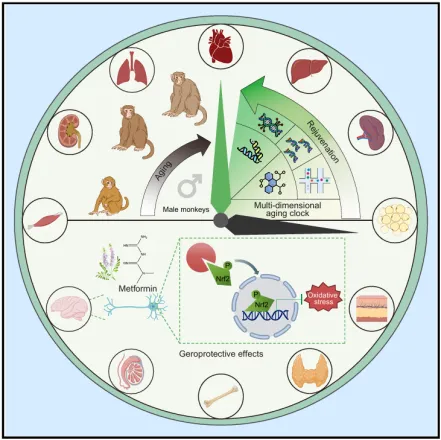 二甲双胍是一种常用于治疗 2 型糖尿病的药物,2024 年 9 月,一项发表在 Cell 期刊上的中科院开展的为期三年多的研究表明,二甲双胍能「全身性」地改善灵长类动物的衰老,包括 11 个系统的 79 种组织器官的「返老还童」,尤其是提高认知能力、延缓大脑衰老的能力巨大(图 2)。