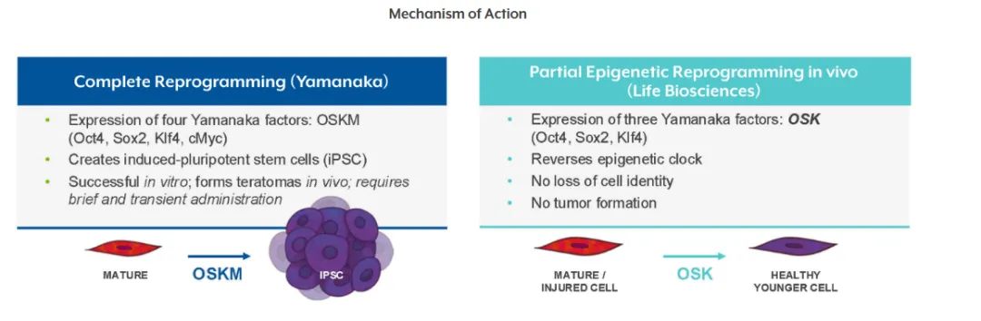 在这一赛道中,Life Biosciences (下称Life Bio)是有代表性的公司之一。Life Bio 的策略是利用三种转录因子 Oct-4、Sox-2 和 Klf-4(简称「OSK」),通过重编程表观基因组,从而使衰老细胞恢复到更年轻的状态,使细胞功能更加有效。
