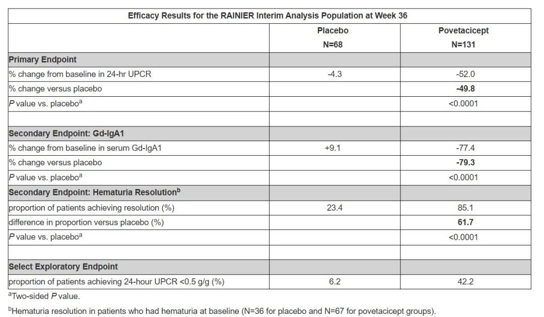 数据显示,该试验达到了主要终点。在中期分析人群中,与基线相比,接受povetacicept治疗的患者在第36周时尿蛋白/肌酐比值(UPCR)降低了52.0%;与安慰剂相比,UPCR降低49.8%,差异具有统计学显著性和临床意义(P<0.0001)。蛋白尿的降低在所有预先设定的亚组中均表现一致。