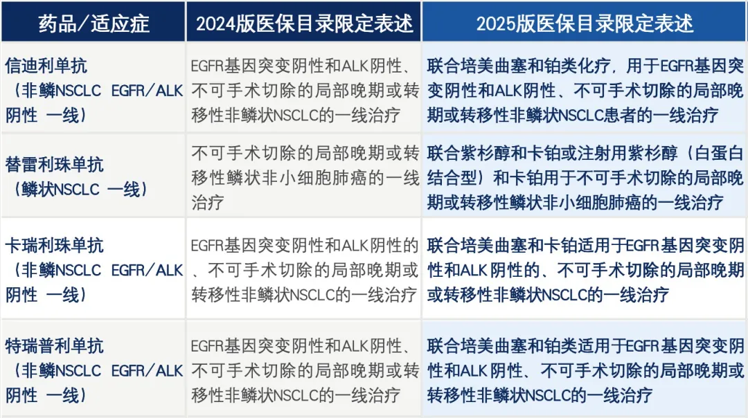 在2024版医保目录中,许多PD-1药物的支付范围仍然采用相对宽泛的疾病表述,例如:“不可手术切除的局部晚期或转移性非鳞状非小细胞肺癌(NSCLC)的一线治疗”。而在2025版目录中,这些表述被细化为:“联合培美曲塞和铂类化疗”。