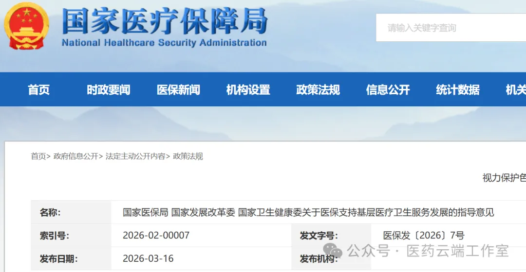 3月16日,国家医保局、国家发改委、国家卫健委联合发出《关于医保支持基层医疗卫生服务发展的指导意见》(医保发〔2026〕7号),三部门联合发文,横向打通了诸多政策壁垒,为基层医疗机构的发展赋予了强大的政策动能。