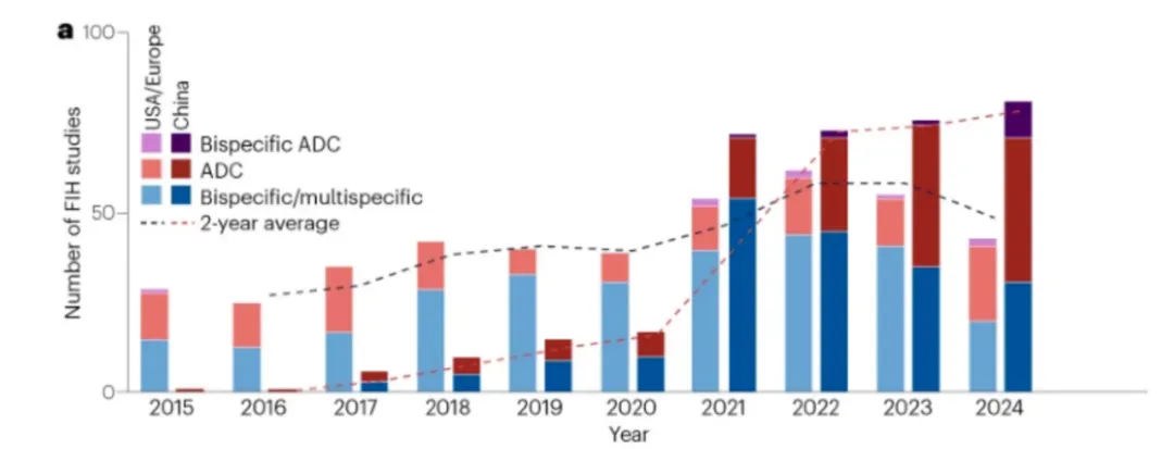 NatureReviewsDrugDiscovery发布的分析报告显示,2015至2024年间,全球进入临床研究的增强型抗体数量已达776个,其中美国或欧洲地区有424个,中国有352个,呈现出全球同步爆发、中国快速追赶的态势。