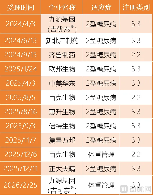 这里需要注意司美格鲁肽注册的特殊现象。同样作为司美格鲁肽仿制药,有的药企选择以2.2类新药(化学药品改良新药)申报,比如齐鲁制药、百克生物(石药集团);而有的药企选择以3.3类新药(治疗用生物制品仿制药)申报,比如九源基因、新北江制药等。