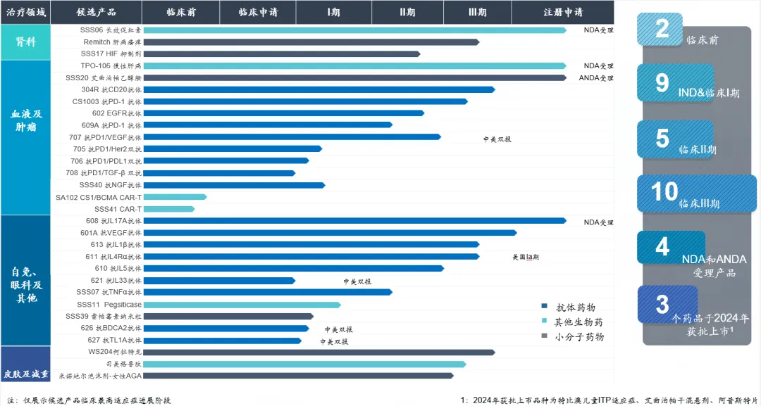 除肾科外,三生制药已构建覆盖肿瘤科、自身免疫性疾病、眼科及皮肤科等多治疗领域的产品矩阵,拥有40余种上市产品,30种在研产品。在自身免疫领域,公司拥有国内首个上市的抗肿瘤坏死因子单抗益赛普;在肿瘤领域,有重组人血小板生成素特比澳等重磅品种。丰富的产品管线和成熟的商业化平台,为公司未来持续增长提供了坚实基础。