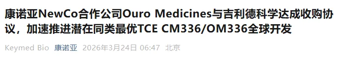 根据并购协议,作为Ouro Medicines股东,康诺亚持有约15%的股份,将在交易完成后获得约2.5亿美元首付款,以及最高约7000万美元里程碑付款,合计收益最高可达约3.2亿美元。同时,CM336/OM336的特许销售分层权益,将由吉利德履行。交易完成后,康诺亚不再持有Ouro Medicines股权。