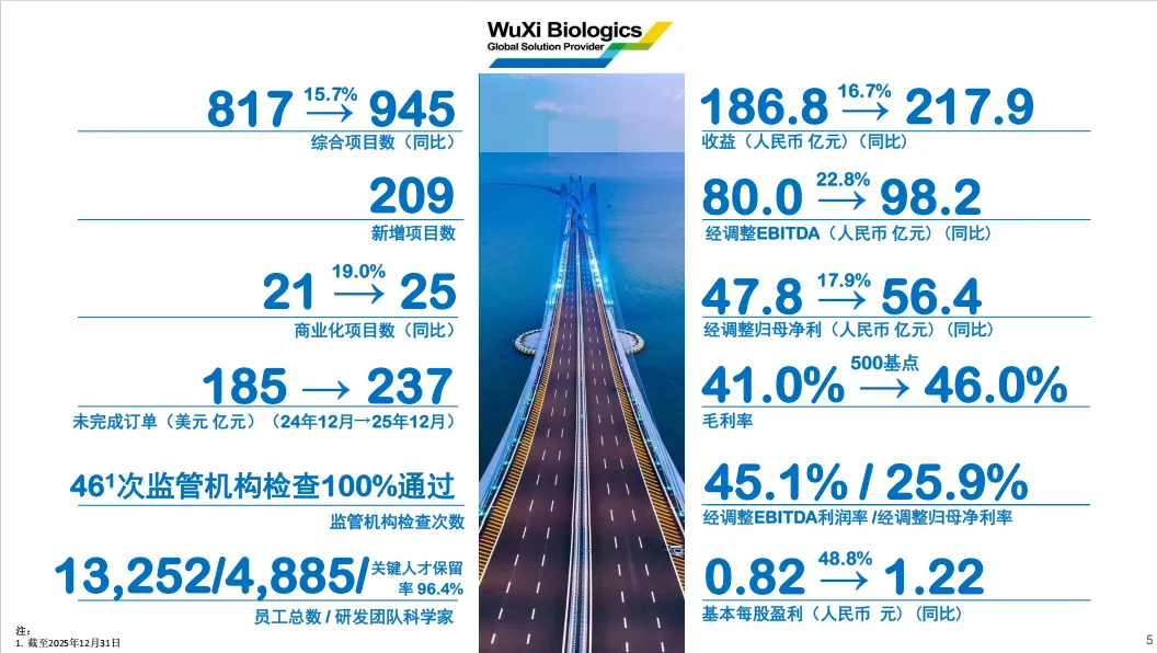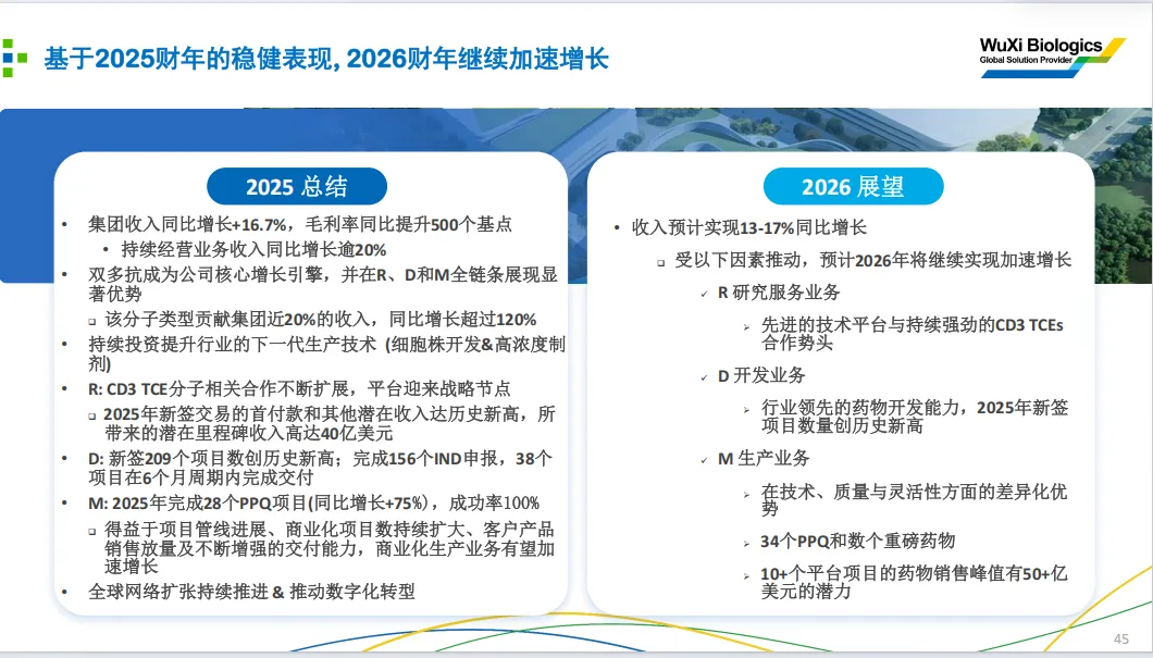 近日药明生物(02269)发布2025年财报:2025年全年实现营收217.9亿元,同比增长16.7%。全年毛利率同比提升5.0个百分点至46.0%,盈利质量显著提升。经调整归母净利润同比增长17.9%至56.4亿元,利润增速均高于收入增速。下半年盈利能力加速提升,主要得益于高利润的研发(R)业务收入(特别是里程碑与销售分成)、运营效率(WBS)优化及产能利用率提升。