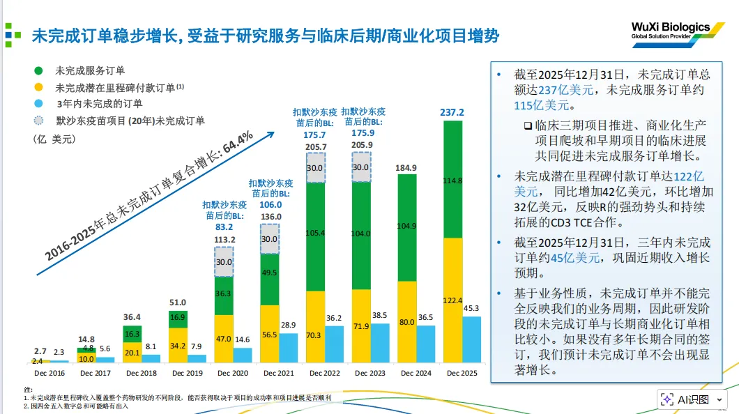 公司披露未完成订单总额从2025年上半年的203亿美元增长至2025年底的237亿美元,全年保持强劲增长势头。增长主要来自未完成潜在里程碑付款订单,从年中的90亿美元跃升至年底的122亿美元,增幅显著,这直接反映了以CD3 TCE平台为首的研发(R)业务合作势头迅猛,为公司积累了巨大的潜在业绩弹性。未完成服务订单稳定在约115亿美元水平。