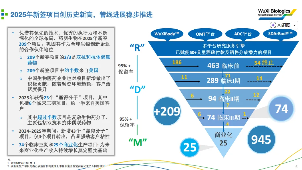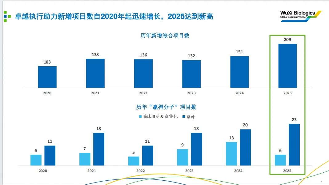 2025全年新签项目总数达209 个,创历史新高,巩固了公司作为全球生物创新企业核心合作伙伴的行业地位。从结构上看,209 个新签项目中,2/3 为双抗、抗体偶联药物(ADC)等高壁垒复杂生物药分子。2025 年新增 “赢得分子” 项目23 个,其中包含 6 个临床三期项目,约半数来自美国客户;超半数项目为双抗、ADC 等复杂生物药分子。2024-2025 年累计新增 “赢得分子” 项目 43 个,仅 4 个项目转出,客户留存能力行业领先。