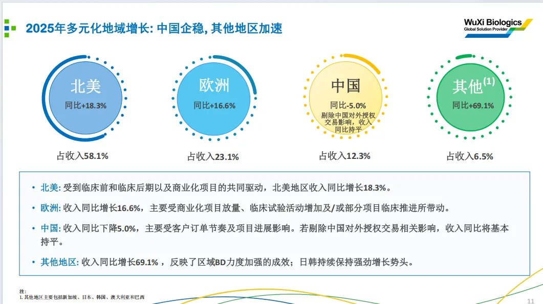 (1)海外成熟市场为绝对基本盘,全球核心竞争力稳固。北美 + 欧洲合计贡献了81.2%的总收入,是公司营收的核心支柱,两大市场均实现 16% 以上的双位数高增长,验证了药明生物在全球生物药 CDMO 核心市场的龙头地位。其中北美市场作为全球生物药产业的核心阵地,以超五成的收入占比、18.3% 的增速,兑现了公司 “临床全周期 + 商业化生产” 全链条服务的核心能力,临床管线与商业化项目双轮驱动的增长逻辑持续落地。