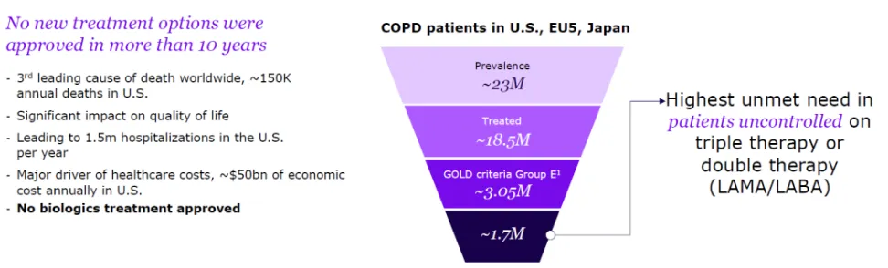 9MW2821之外,迈威生物多款创新药处于临床阶段。9MW1911为全球第2款ST2单抗,COPD 2a期临床数据显示,在RP2D剂量下,中重度COPD急性加重年化发生率下降超30%,重度急性加重年化发生率减低超40%。COPD为全球范围内第三大死亡因素,仅美国、欧盟五国、日本主要发达国家市场就有2300万例患者,美国每年15万例患者因COPD死亡,存在严重的未满足临床需求。目前COPD领域,赛诺菲IL-33抗体Itepekimab,罗氏/安进的ST2抗体Astegolimab均已完成三期临床。Itepekimab在三期临床AERIFY-1 达到主要终点,显著降低中度或重度急性加重年发生率 27%,而 AERIFY-2 未达主要终点。Astegolimab三期临床ARNASA中急性加重年化发生率降低14.5%,未达到统计学显著性。相比之下,9MW1911的疗效数据优于Itepekimab和Astegolimab,有望改变COPD的临床治疗格局。