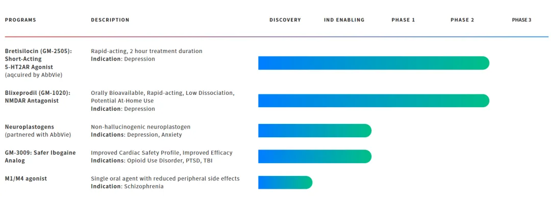 该公司的心脏安全ibogaine类似物GM-3009预计将于今年晚些时候进入1期临床研究。Gilgamesh还继续推进与AbbVie的合作,为神经精神疾病开发神经母质疗法,进一步增强了人们对该公司发现平台潜力的信心。Gilgamesh内部管线的其他项目正在朝着IND支持研究和早期临床开发的方向发展。