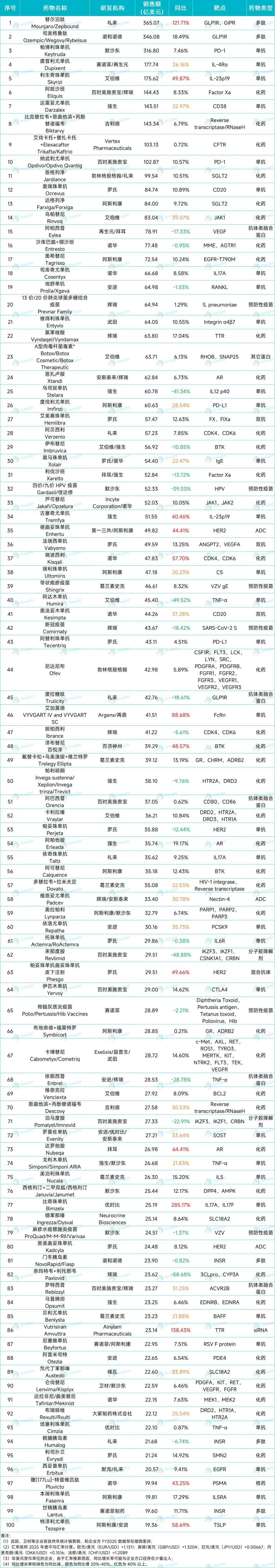 2025 年全球药品销售额 TOP100 榜单尘埃落定,看似熟悉的名单背后,格局已悄然生变,有将近 10 个新面孔首次亮相。
