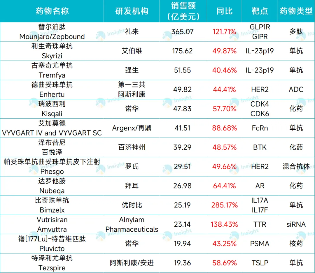 在 2025 年的 TOP100 榜单中,共有 13 款药物实现了同比增速超过 40%,其中有 2 款药物的年销售额更是在百亿美元以上。