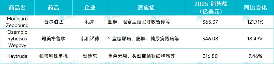最亮眼的当属礼来的替尔泊肽。该药在 2025 年大卖 365.07 亿美元,同比大增 164.66%,一举超过诺和诺德的司美格鲁肽和默沙东的 K 药,荣登 2025 年新药王。同时,凭借这款重磅药物,礼来全年营收达到 651.79 亿美元,首次问鼎全球制药业务收入第一。