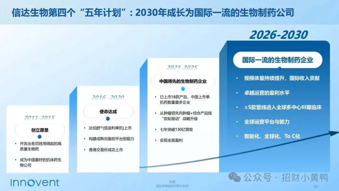 围绕2030年长远愿景,信达明确四大核心目标,筑牢发展确定性。收入端,国内业务保持高速增长,2027年200亿元营收目标近在咫尺,国际化收入将成为后续核心增量。利润端,国内业务盈利质量将逐渐看齐一流药企,稳步提升利润率。管线端,推动至少5款管线完成全球三期临床并上市,搭建全球化商业化矩阵。运营端,搭建覆盖全球的研发商业网络,实现全面国际化。国内基本盘的成长性和确定性,海外的布局提供长期弹性,使信达的价值重估空间极为广阔。